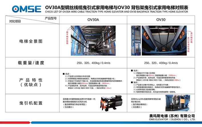下圖為OV30A新一代復合鋼絲線纜曳引式家用電梯與OV30背包架曳引式家用電梯在設計結構上以及產品特性上的對照表。