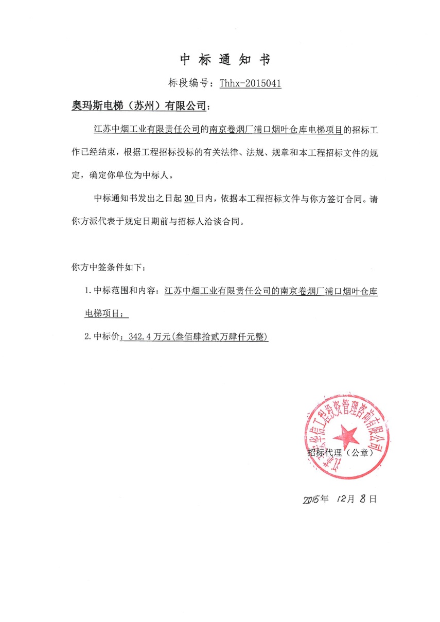 圖4:江蘇中煙工業有限責任公司南京煙廠浦口煙葉倉庫電梯項目中標通知書