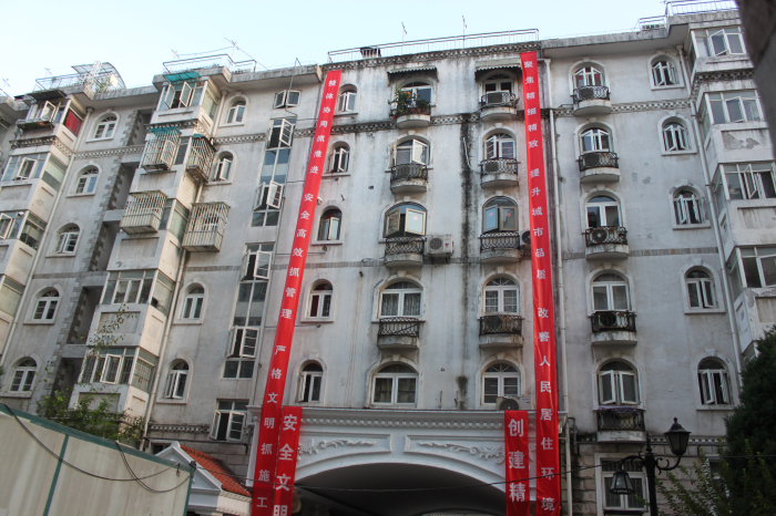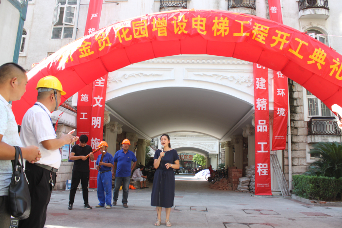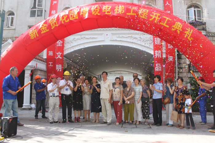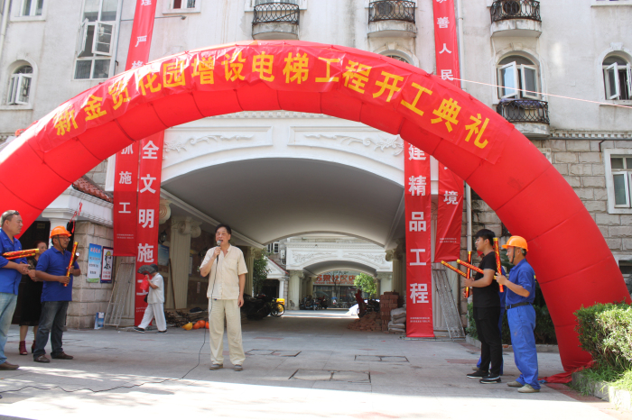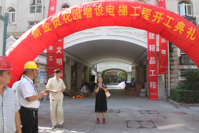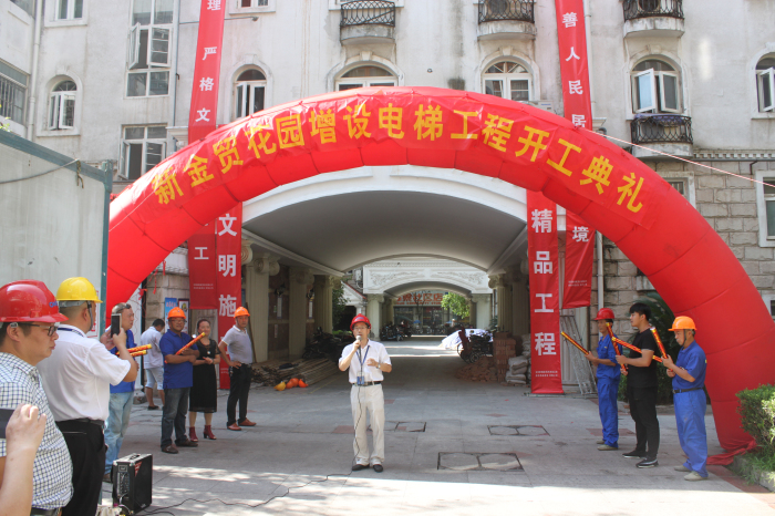 2017年8月24日上午8:00時分,南京市區(qū)風(fēng)和日麗,位于南京市鼓樓區(qū)的新金貿(mào)花園小區(qū)主道路兩旁一派喜慶熱鬧的景象:一個大大的拱形大紅氣球門上寫著“新金貿(mào)花園增設(shè)電梯工程開工典禮”幾個醒目的大字。4條長長的橫幅分別從7樓頂處及2樓處高掛而下,橫幅上“創(chuàng)建精品工程,安全文明施工”這些白色的大字同樣引人注目。