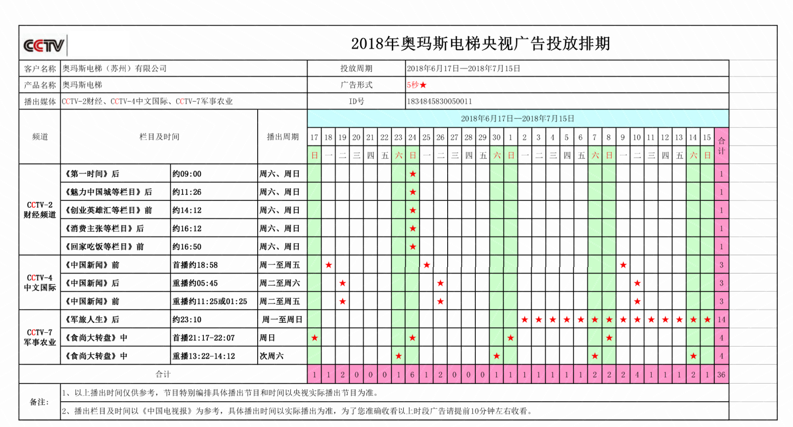 2018年6月17日、6月18日正逢中國父親節(jié)及傳統(tǒng)節(jié)日――端午節(jié)。奧瑪斯精心打造的廣告片就是在這喜慶的日子里,分別于當日的22:01時許及18:59時分通過CCTV-7,CCTV-4頻道向全國人民展播的。