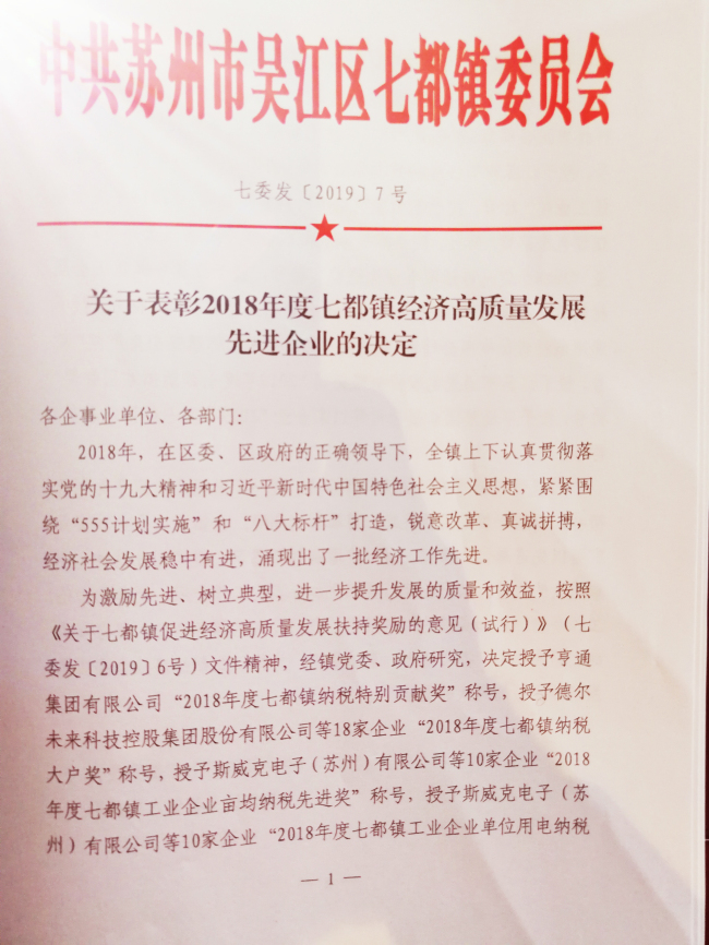 2019年2月14日,豬年初十,情人節。下午2:00時分,公司潘偉榮總經理從開會現場傳來喜訊:奧瑪斯電梯(蘇州)有限公司榮獲“2018年度吳江七都鎮單位用電納稅先進獎” (見下列獲獎名單及獎牌) 及“2018度年吳江七都鎮單位納稅百強企業”的殊榮。這種榮譽,奧瑪斯公司連續保持了4年。