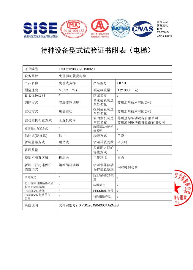 21噸貨梯型式試驗報告: